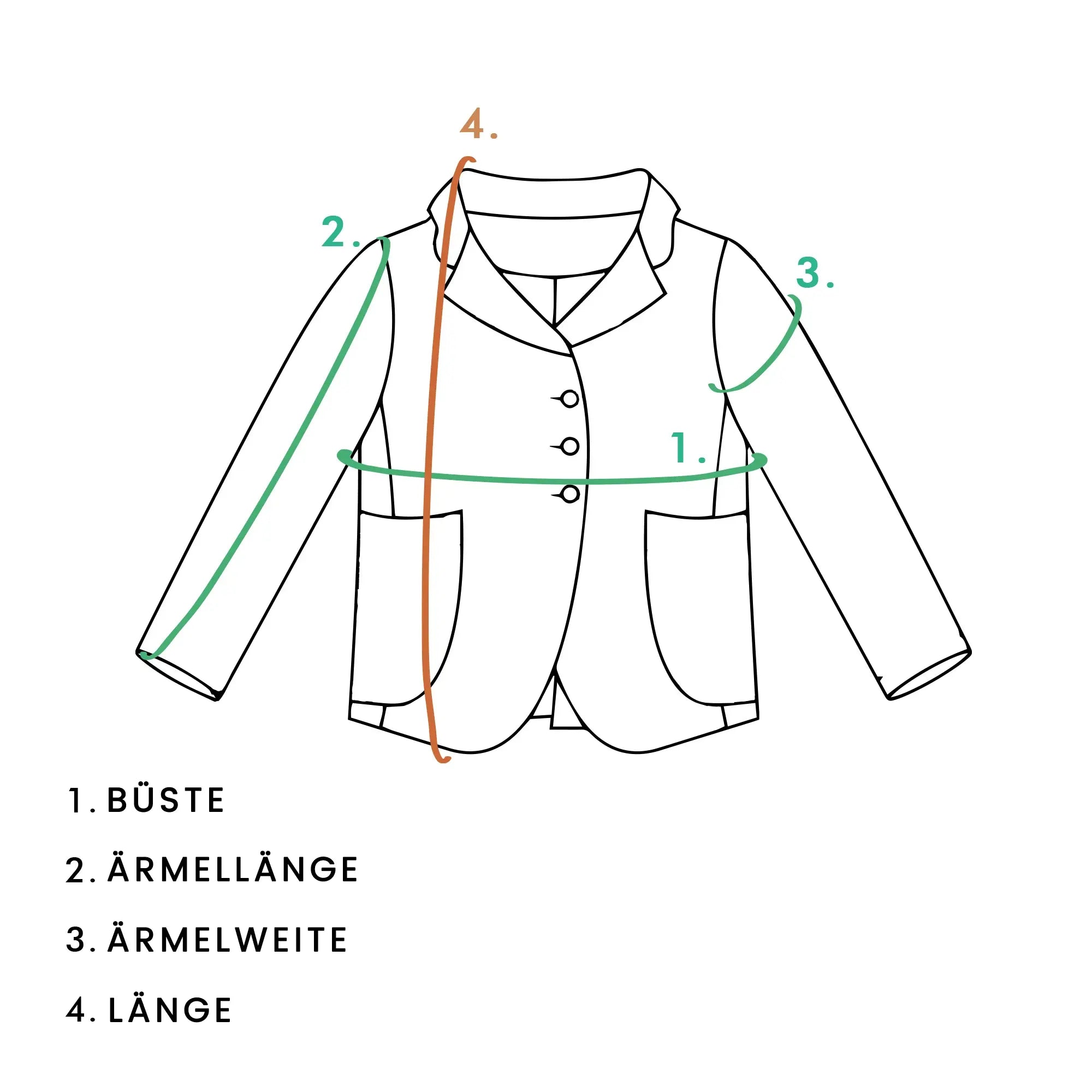 | Größe | Brustumfang (cm) | Ärmellänge (cm) (vom Hals) | Ärmelweite (cm) | Länge (cm) |