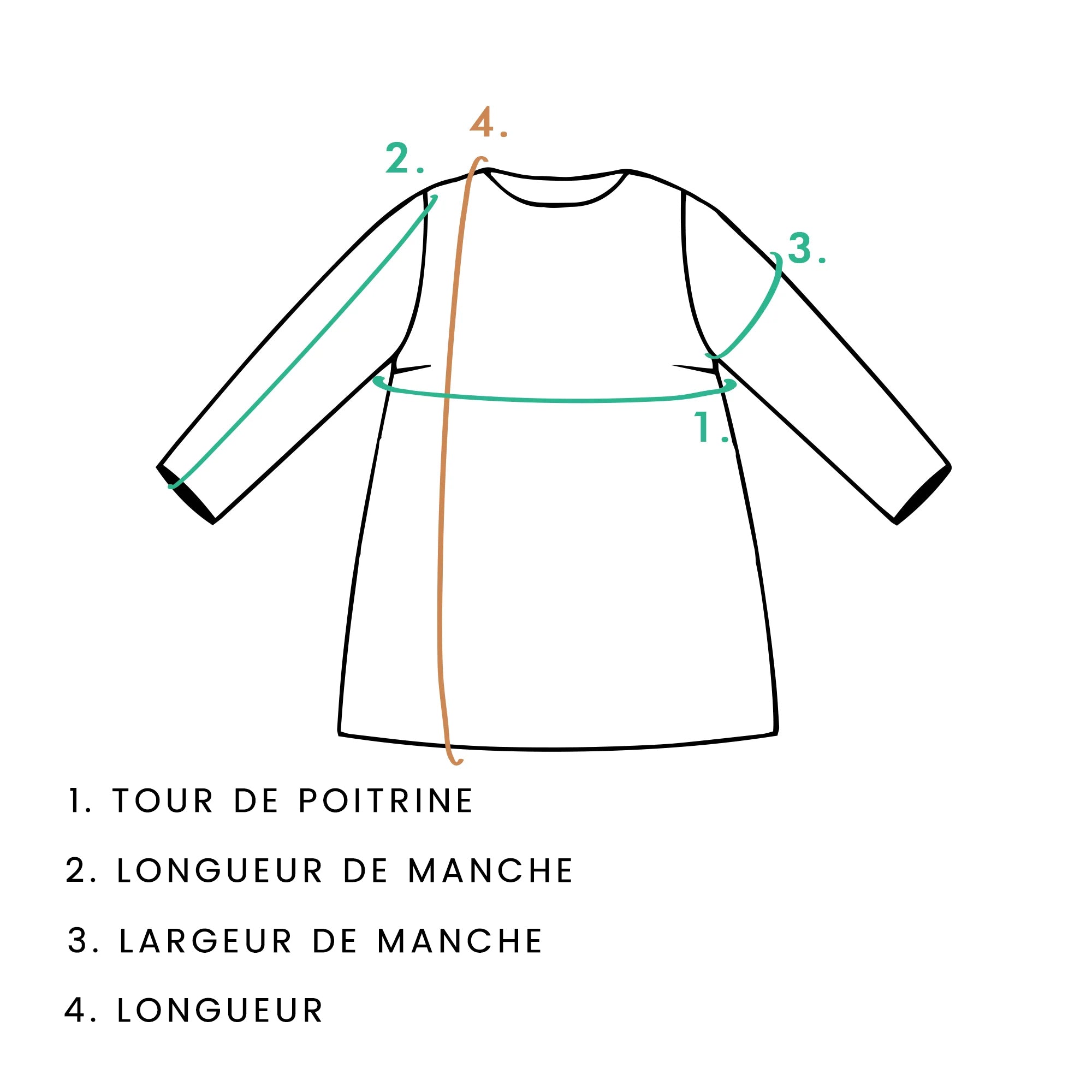 | Taille | Buste (CM) | Longueur de manche (CM) | Largeur de manche (CM) | Longueur (CM) |