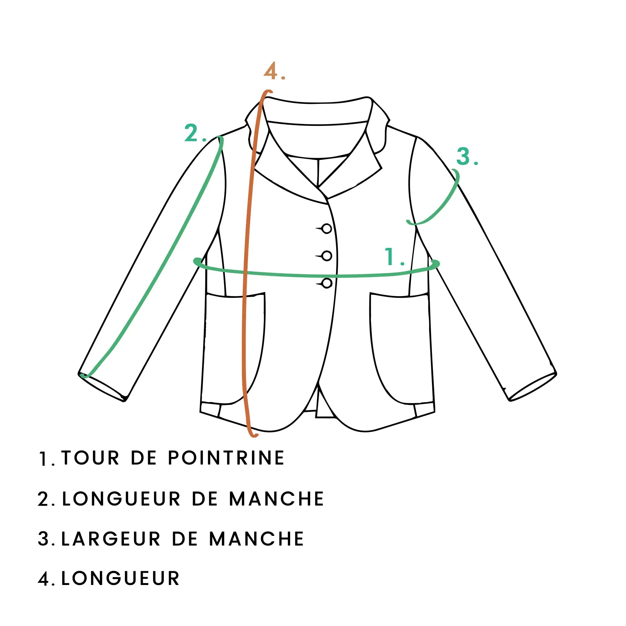 | Taille | Tour de poitrine (cm) | Longueur des manches (cm) (à partir du cou) | Largeur des manches (cm) | Longueur (cm) |