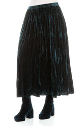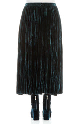 Cette jupe en velours de soie présente une texture légèrement froissée et un éclat riche qui se transforme gracieusement au gré des mouvements. Sa coupe trapèze fluide et sa taille élastiquée offrent une élégance naturelle et un confort optimal en toute occasion.