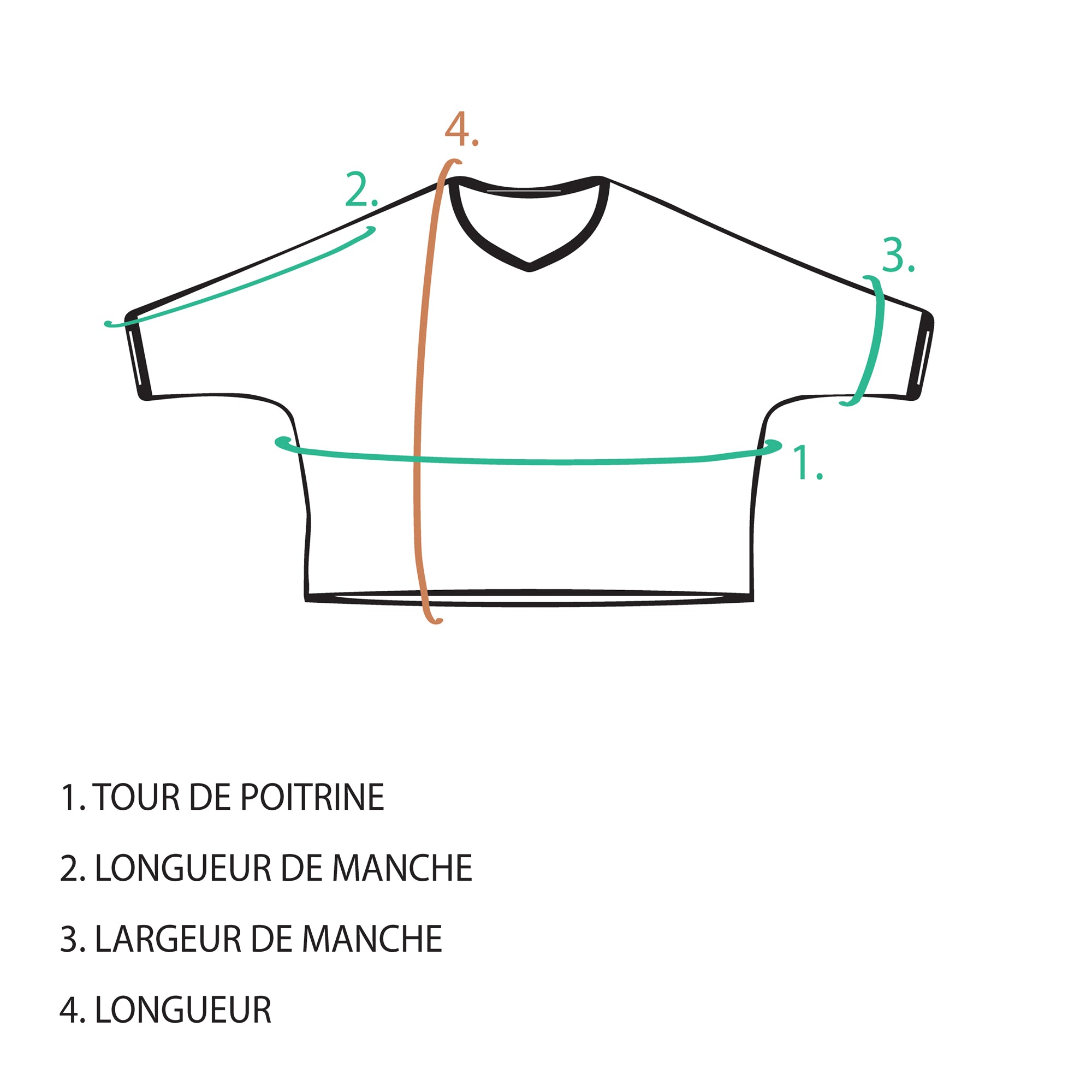 | Taille | Buste (CM) | Longueur de manche (CM) | Largeur de manche (CM) | Longueur (CM) | Longueur du dos (CM) |