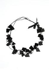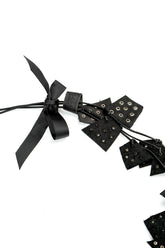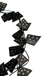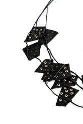 Crafted from supple black leather, this striking necklace showcases layered geometric pieces finished with bronze grommets for a contemporary, industrial touch. The multi-strand structure adds depth and movement, while the ribbon tie allows easy adjustment to your preferred length. A bold yet versatile statement piece that elevates both everyday looks and special-occasion outfits.