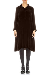 Enjoy every occasion in style with this dress, beautifully crafted from soft, luxurious silk velvet. It features a collar neckline with front buttons at the bust and a flattering A-line silhouette with a fluid skirt, making it the perfect choice for your next special event. Pair it with a silk chiffon shawl or scarf for an unforgettable look.