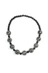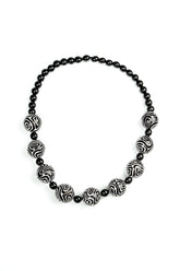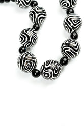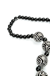 A striking statement necklace featuring wooden beads in bold black and white contours. The beads create a gentle sound with movement, adding a lively, tactile quality to the piece. Lightweight and effortless to wear, this design offers a sculptural, artistic finish that elevates both everyday outfits and occasion looks.