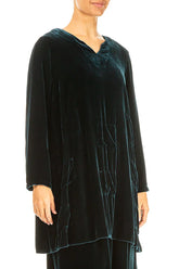 A luxuriously soft silk velvet tunic with a refined V neckline and fluid drape. Its relaxed yet elegant silhouette makes it an effortless choice for both special occasions and sophisticated day-to-evening dressing.