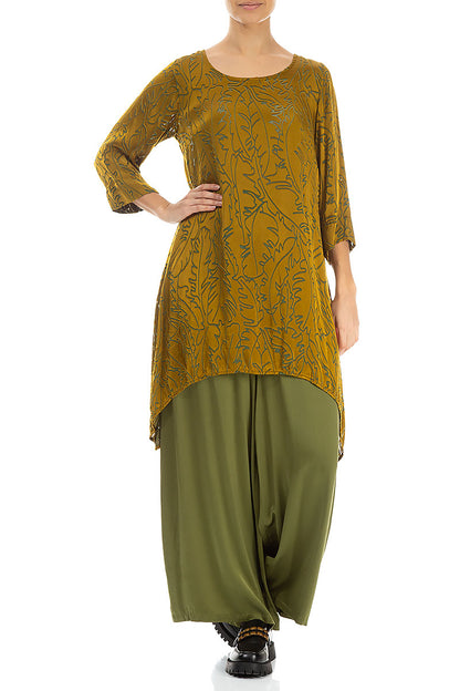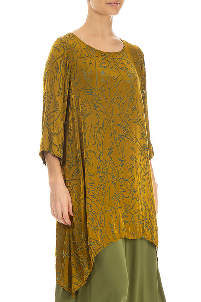 Dropped Edge Golden Olive Devoré Feather Silk Tunic