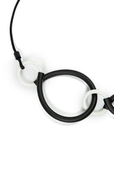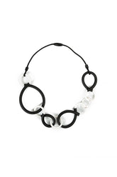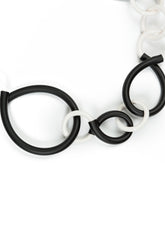 The monochrome motion necklace brings bold simplicity to your look. Its clean black-and-white palette makes it effortlessly versatile, while the fluid arrangement of rubber loops and white accents creates a dynamic, sculptural feel. Whether styled with casual knits or elegant evening pieces, it adds instant artistic flair and a touch of modern confidence.