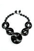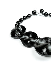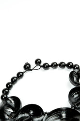 A bold, sculptural piece that blends recycled wood with smooth bamboo elements, this necklace creates a striking modern silhouette. The glossy black discs form a fluid arrangement that catches the light beautifully, giving the piece both depth and movement. Lightweight and comfortable to wear, it fastens with an adjustable tie, allowing you to choose the perfect drop. An expressive accessory that instantly elevates both simple and statement outfits.